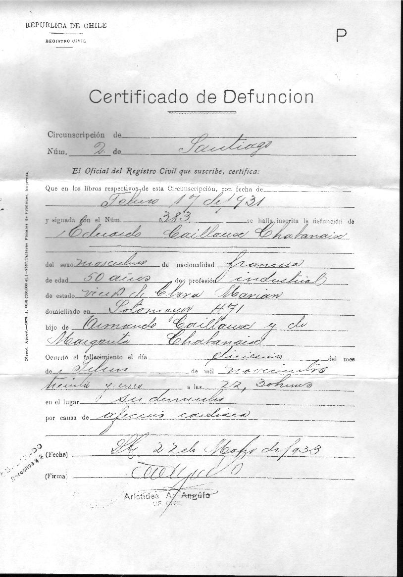| Died: | 16/02/1931 of Heart Attack in Santiago, CHILE | Certified | Mother: | Juana Francisca Margarita Chavaneix Frescarada (20/08/1860 - 23/07/1889) |