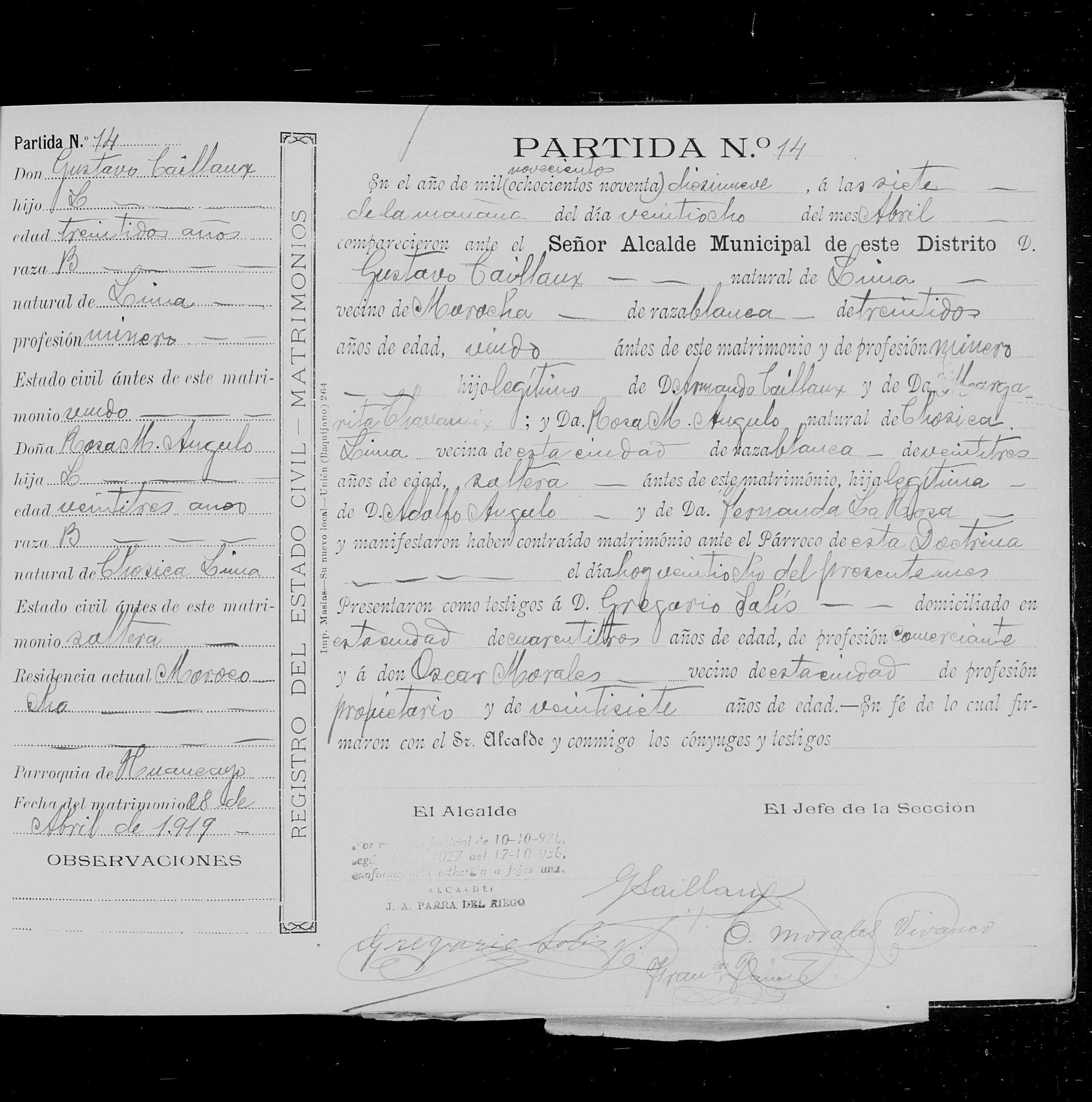 | Certificado de Matrimonio | Certificado de Matrimonio - gracias a familysearch.com | 28/04/1919 |