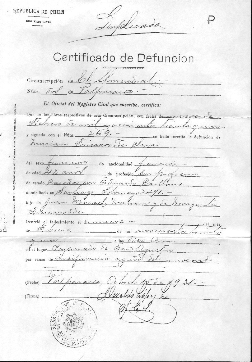 | Died: | 09/02/1931 of Heart Failure due to food poisoning in Valparaiso | Certified | Mother: | Margarita Paulina Frescarode (Born 00/00/1846) |